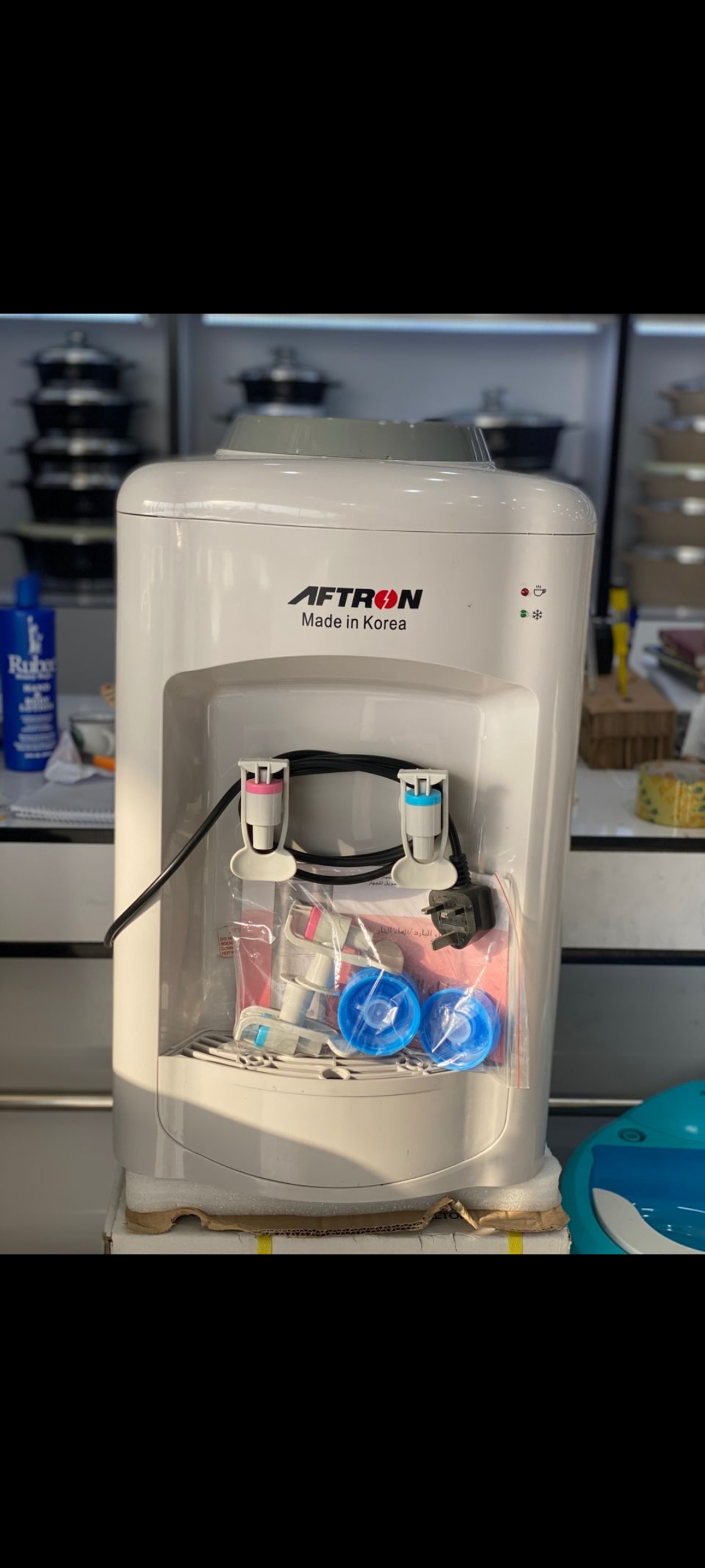 آبسردکن افترون رومیزی AFWD-3700 Aftronآب سرد کن افترون مدل رومیزی یکی از آبسردکن های پرطرفدار و باکیفیت موجود در بازار است. با استفاده از این آبسردکن آب خنک همیشه در دسترس شما خواهد بود.آبسردکن رومیزی افترون Aftron تولید کشور کره است و دارای دو خروجی مجزا آب سرد و گرم می باشد.آبسردکن رومیزی مارک افترون دارای طراحی شیک و مدرن است که استفاده از آن در منازل و اماکن مختلف جلوه ای خاص به محیط می بخشد.آبسردکن دوکاره رومیزی افترون جهت استفاده در منازل، ادرات با جمعیت متوسط، آپارتمان ها و… بسیار مناسب می باشد.آب سرد کن دو منظوره Aftron دارای کمپرسور پر قدرت با راندمان بالا و توان سرمایشی 100 وات است که در کوتاهترین مدت آب را خنک می کند. دمای آب تولیدی آبسردکن 4 درجه سانتی گراد می باشد.