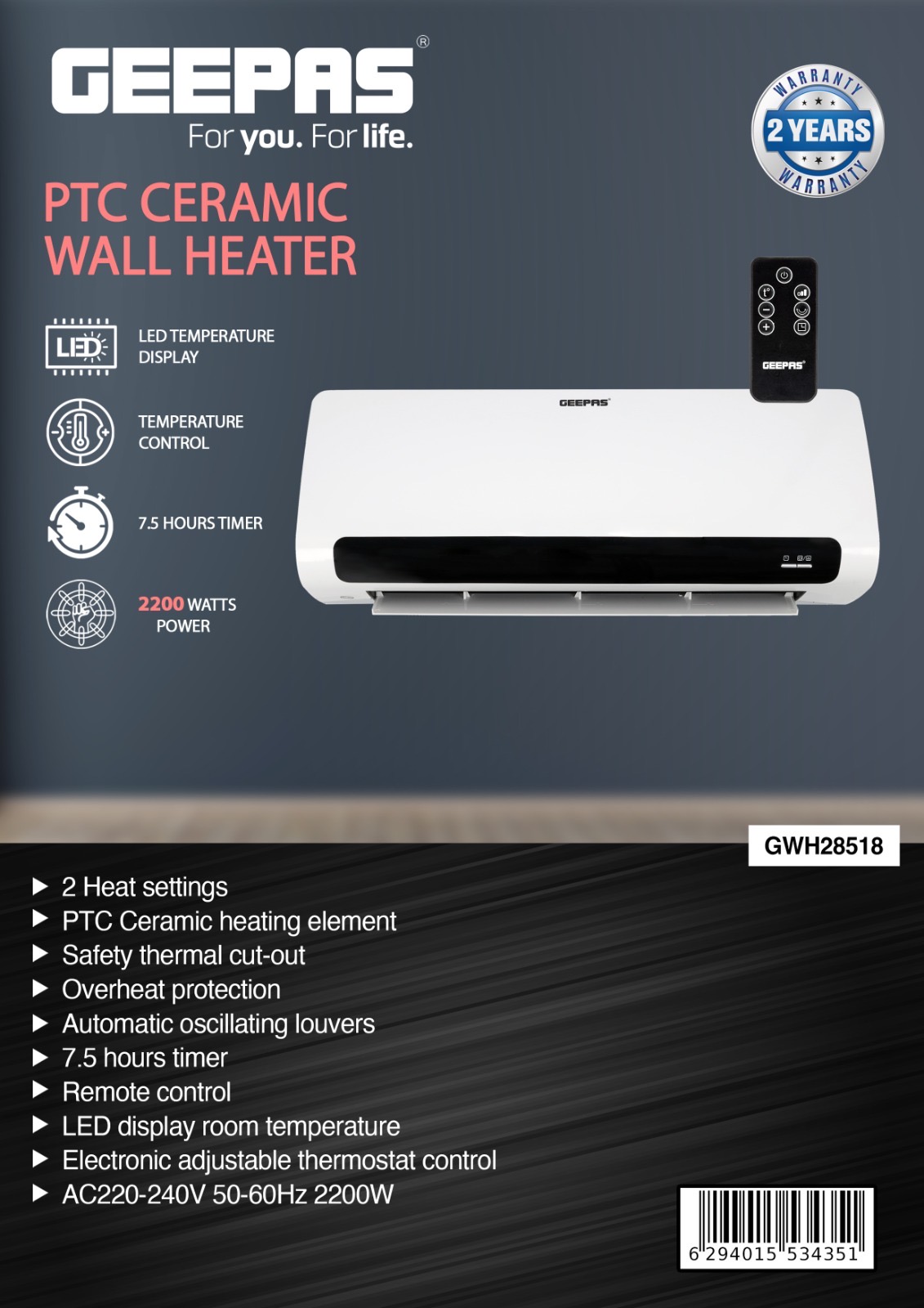بخاری برقی جی پاس مدل GWH28518 دارای قدرت گرمایشی 1500 الی 2200 وات دارد که حداکثر توان خروجی آن 2200 وات هست. این بخاری برقی جیپاس GWH28518 را می توان همچون کولر اسپلیت به دیوار نصب نمود و هم می توان در محیط ثابت بر روی میز گذاشت. پنل دیواری این محصول با دو عدد میخ پیچ و رول پلاک که در داخل کارتن هست میتوان نصب نمود. جنس بدنه این محصول از پلاستیک مقاوم بوده که در برابر گرما مستحکم هست و تغییر رنگ نمی دهد. این بخاری برقی جهت حفظ امنیت بیشتر، دارای سیستم قطع کن خودکار می باشد یعنی اگر به هر دلیلی محصول از روی دیوار یا میز بیفتد ، بخاری به طور اتوماتیک خاموش می شود تا آسیبی به محیط وارد نکند. همچنین دارای تایمر قابل تنظیم می باشد که میتوان بستگی به نوع محیط و نیاز خود از زمان 30 دقیقه و حداکثر 8 ساعت آن را تنظیم نمود.